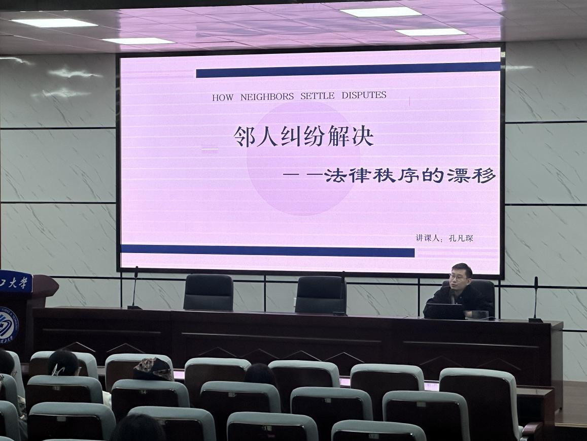 紧接着,孔凡琛老师以邻人解纷规范的构建为切入点,深刻揭示了邻人规范的产生背景与重要性。他通过详细的剖析和讲解,使同学们对邻人规范有了更为深刻的认识。孔凡琛老师通过分析邻人解纷的引导理念、实现方案等方面,向同学们生动形象地讲述了邻人纠纷的解决之道。他结合具体案例,深入浅出地讲解了如何运用邻人规范来有效化解邻里纠纷,为同学们提供了宝贵的实践经验和启示。