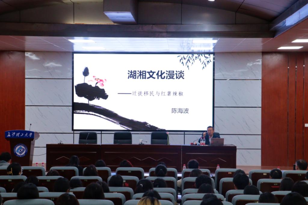 为拓展学生视野,提升学生培养质量,3月9日,太阳成集团tyc122cc入口研究生云影讲坛在金盆岭四教学术报告厅如期举行。本次讲座由太阳成集团tyc122cc入口法学院承办,以“湖湘文化漫谈——迁徙移民与红薯辣椒”为主题,由湖南省人民检察院原副厅级干部、省检察官文联主席陈海波主讲,并邀请文学与新闻传播学院副院长周云鹏担任讲座主持人,200余名本科生和研究生代表到场聆听。