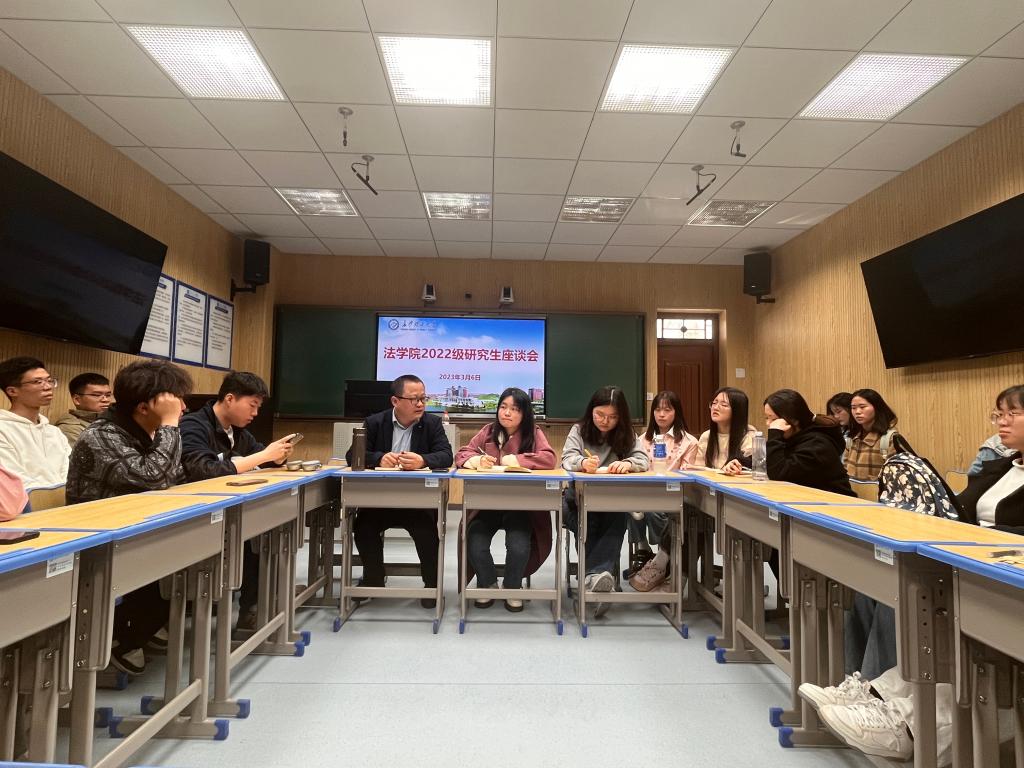 为了深入了解学生需求,做好学生管理及服务工作,3月6日下午,太阳成集团tyc122cc入口法学院在金盆岭校区四教312智慧教室,组织召开2022级研究生座谈会。本次座谈会由研究生辅导员曾宇欣主持,法学院党总支副书记兼副院长汪功伟出席本次会议,全体2022级研究生参加。