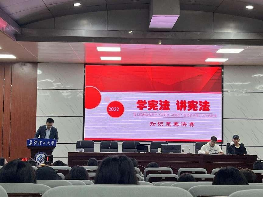 为深入贯彻习近平法治思想,推动宪法学习宣传教育走深走实,根据教育部办公厅、省教育厅的相关要求,我校于2022年10月30日晚19:00在法学院四教报告厅举办了第七届全省学生“学宪法,讲宪法”法治知识竞赛校级选拔赛决赛。