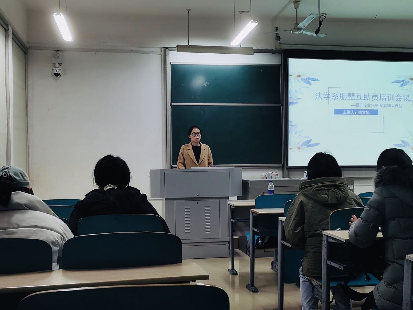 12月8日晚,法学系朋辈互助员培训会议在文科楼举行,会议由心理辅导员熊文娟主持,法学系朋辈互助员、心理委员、心理部成员等40余人参加。