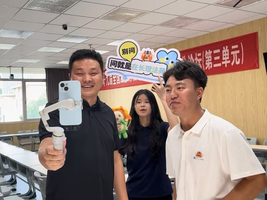 下班党员和主要学生干部组成的直播团队手持自拍杆金盆岭校区东南门出发,途径电苑楼、图书馆到达四号教学楼法学院)。在法学院内,学院党委副书记汪伦、学工办主任孙佳乐、新生辅导员兰贵辉等线上与新生进行了亲切地交流互动。随后,直播团队带领新生参观了学院法律援助中心、学术报告厅、羽毛球场、行政办公区、智慧教室、模拟法庭等场所,并一路前往西苑食堂及2024级新生即将入住的新生宿舍新生迫切希望了解的重要地点