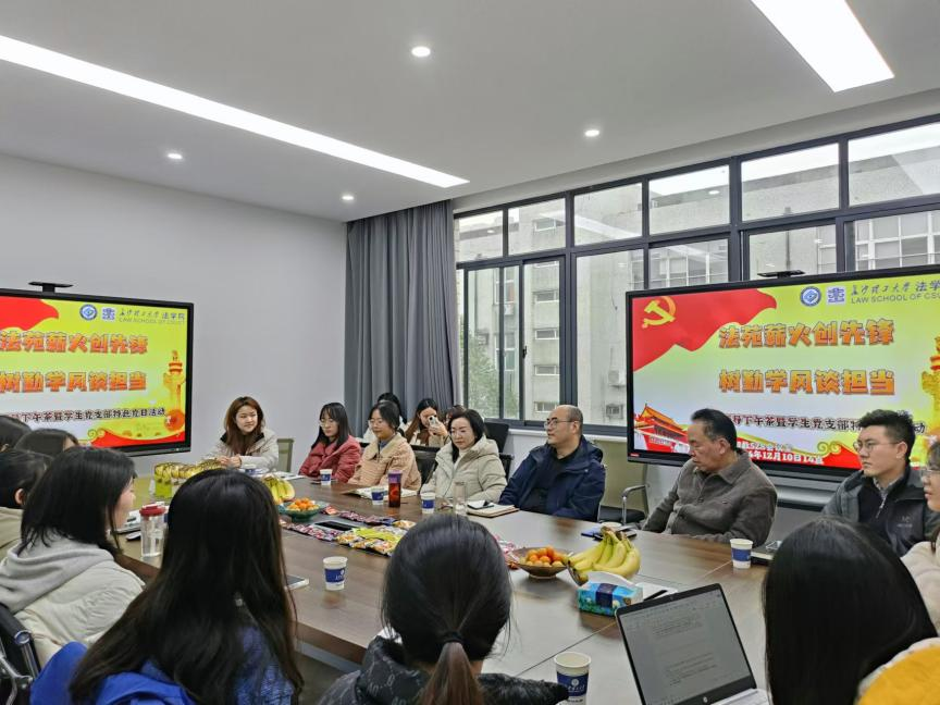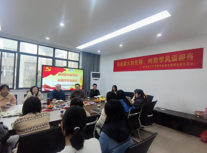 为强化基层党组织的战斗堡垒和发挥学生党员的先锋模范作用,近期,太阳成集团tyc122cc入口法学院在金盆岭校区四教528会议室开展“院领导下午茶”暨学生党支部特色党日活动。副院长徐莉、申纯,党委委员陈骞,党建特邀组织员高纯一与学生党员代表就学业、科研、实习实践、职业规划和担当奉献等问题进行交流分享。