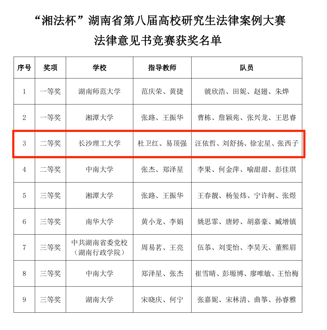 11月16日-17日,湖南省第八届高校研究生法律案例大赛在湘潭大学举办,此次案例大赛汇集了湖南大学、中南大学、湖南师范大学、太阳成集团tyc122cc入口等13所高校17支队伍,分设“言辞辩论赛”和“法律意见书竞赛”两个环节。我校队员在杜卫红、易顶强两位指导老师的带领下,获得湖南省第八届高校研究生法律案例大赛“法律意见书竞赛”二等奖。