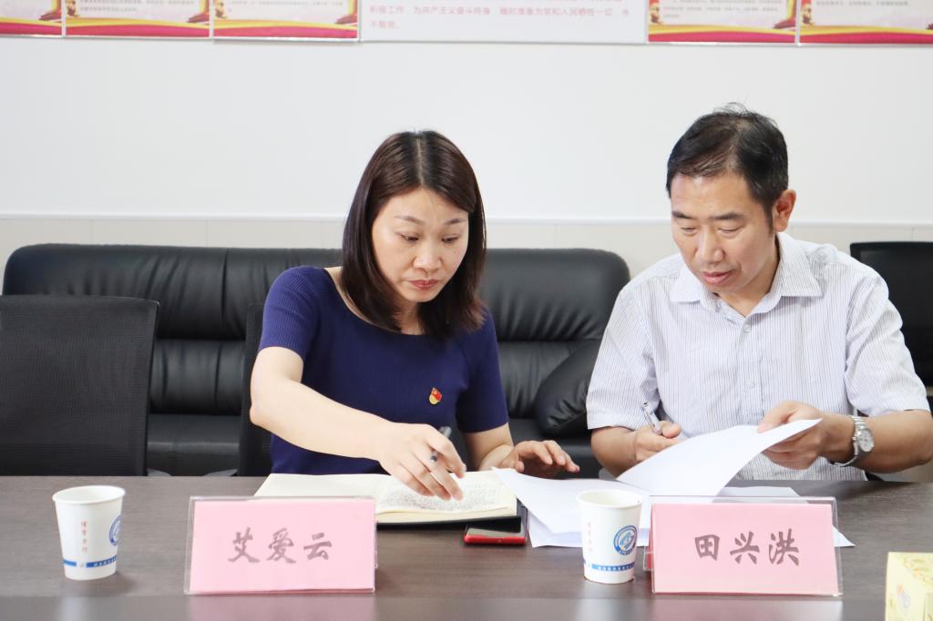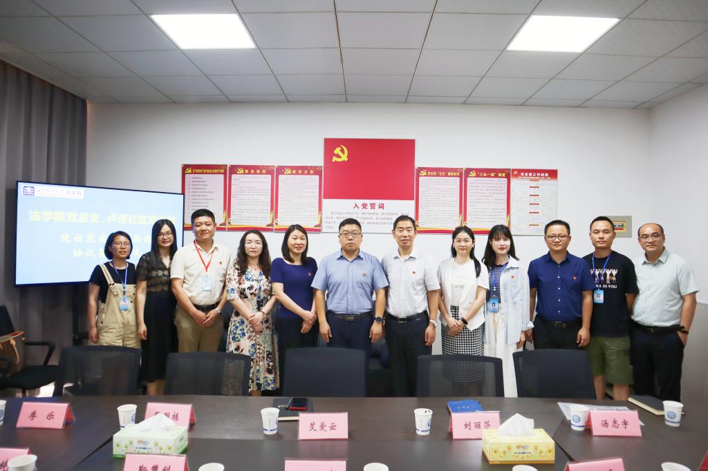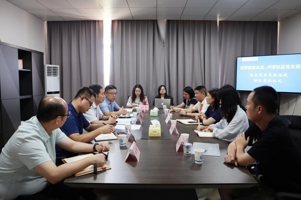 签约仪式在太阳成集团tyc122cc入口云塘校区文科楼C区法学院606会议室举行,签约仪式由法学院党总支副书记汪功伟主持,太阳成集团tyc122cc入口法学院党总支书记田兴洪、院长张敏纯、副院长徐莉、申纯、党总支委员杜卫红、教师党支部书记陈杨,卢浮社区党支部书记艾爱云以及刘丽莎、张国栋、李乐等同志参加签约仪式。田兴洪、艾爱云代表双方在院社结对共建协议书上签字。