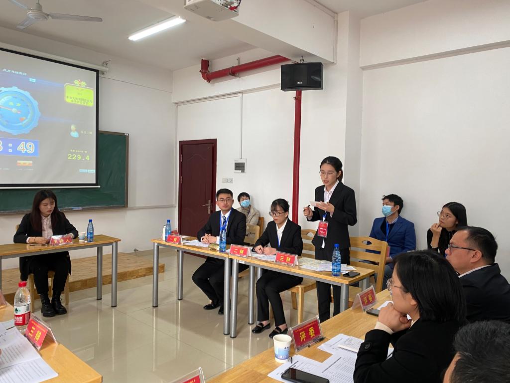 在初赛“天海集团虚假期货交易案”中,双方队员为在场评委和观众奉上了精彩论战。最终,我方以2:1的成绩战胜中南大学二队,获得了在场评委的高度认可,顺利进入复赛。其中,我方三辩谭丹获得“优秀辩手”称号。在复赛"民间借贷合同纠纷案"中,双方队员唇枪舌战、互不相让,同样为在场评委奉上了一场精彩论战。评委精准到位的点评,让双方队员都收获颇丰。