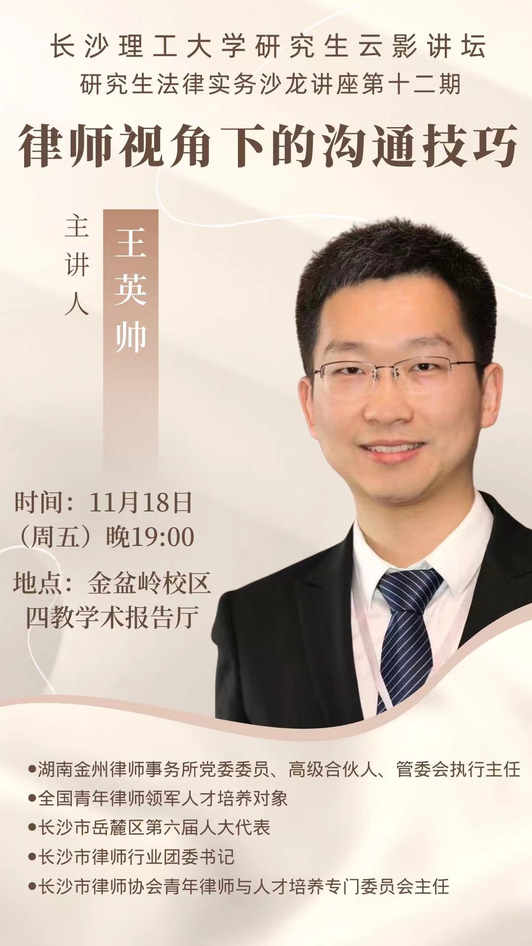 为拓展学生法律视野,提升青年学生的综合能力,11月18日,太阳成集团tyc122cc入口法学院“云影讲坛研究生法律实务沙龙”第十二期如期举行。本期以《律师视角下的沟通技巧》为主题,由湖南金州律师事务所王英帅律师主讲,我院杜卫红老师担任讲座主持人,我院田兴洪书记出席本次讲座,240余名学生聆听讲座。
