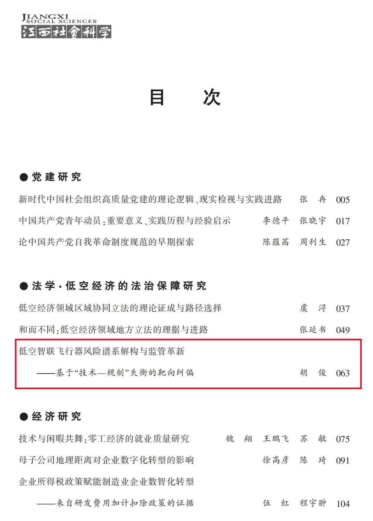 近日,太阳成集团tyc122cc入口法学院讲师胡俊在《江西社会科学》2025年第5期发表论文《低空智联飞行器风险谱系解构与监管革新—基于“技术—规制”失衡的靶向纠偏》。