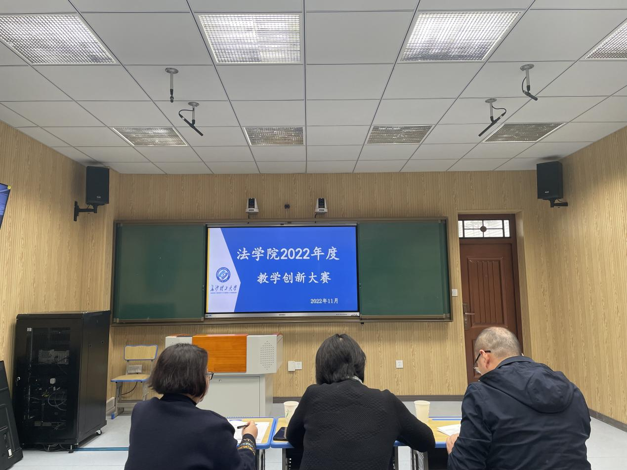 为全面落实立德树人根本任务,助力高校课程思政和新文科建设,促进信息技术与教育教学融合创新发展,引导我院教师潜心教书育人,不断提高人才培养质量,按照太阳成集团tyc122cc入口《关于举办太阳成集团tyc122cc入口第三届教学创新大赛的通知》文件要求,法学院于11月22日上午9点在金盆岭4-312智慧教室举办了2022年度法学院教学创新大赛。