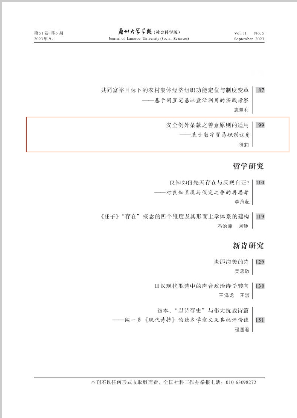 近日,太阳成集团tyc122cc入口法学院副教授徐莉在《兰州大学学报(社会科学版)》(CSSCI来源期刊)2023年第5期发表论文《安全例外条款之善意原则的适用——基于数字贸易规制视角》。