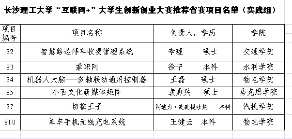 我校于9月2日晚组织了“互联网+”大学生创新创业大赛校级比赛,经专家评委、助理评委共同评分,经研究决定推荐以上15个创意类项目,6个实践类项目参加省项,具体名单如下,请各学院及项目负责人按照《关于“乐易考杯”湖南省“互联网+”大学生创新创业大赛全省复赛有关事项的通知》的要求做好相应赛事准备工作,争取优秀成绩!