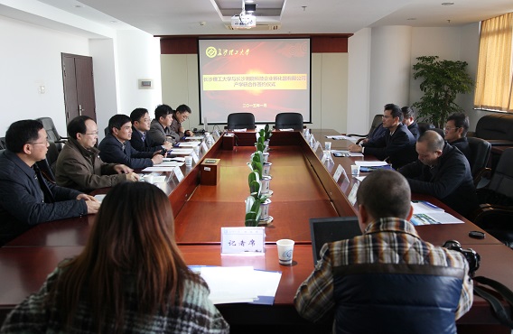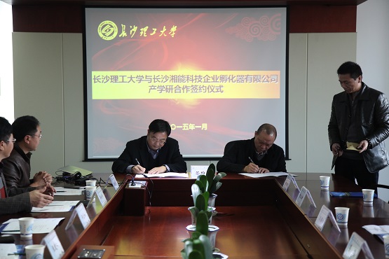 1月14日下午,我校依托长沙湘能科技企业孵化器有限公司建设大学生创业基地正式签约。湖南省科技厅高新处处长李捷,湘能孵化器董事长吴德松、总经理蒋辉、副总经理喻立新等一行5人,我校副校长张建仁、副校长邹宏如、科学研究部、产学研促进办公室、招生就业处等部门有关负责同志出席了本次会议。招生就业处处长邹兴平主持会议。