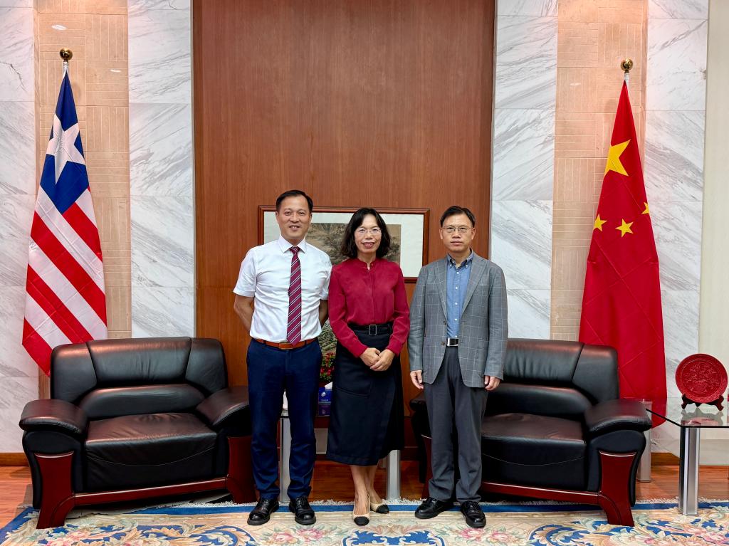 中国驻利比里亚大使尹承武先生(右一)接见我校利大孔院新老两任中方院长