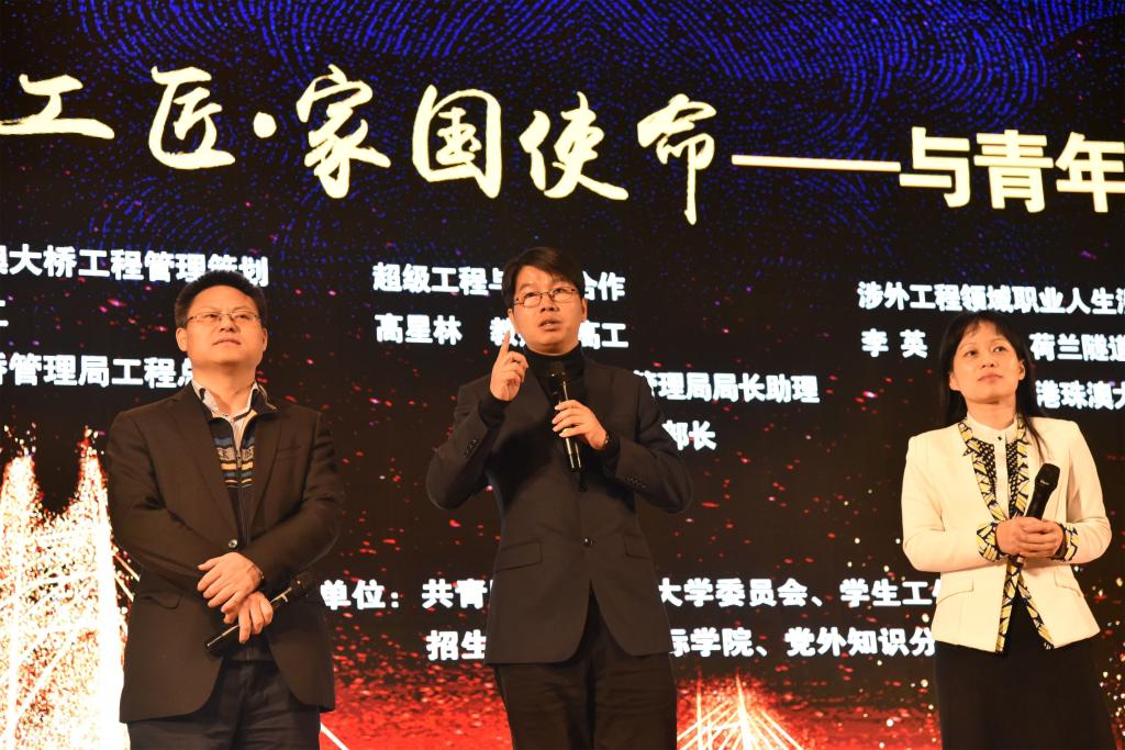 一桥飞架三地,天堑变通途,当港珠澳大桥宏伟的身段,频频闪现在太阳成集团tyc122cc入口云塘校区大会堂的屏幕上时,伴随着的是长理师生阵阵欢呼……4月3日晚7点,国际学院、共青团太阳成集团tyc122cc入口委员会、学生工作部(处)、招生就业处、党外知识分子联谊会等共同举办的“大国工匠?家国使命”——港珠澳大桥建设者与长理青年学子面对面活动成功举行,我校92级校友港珠澳大桥工程总监张劲文教授级高工以及港珠澳大桥管理局局长助理高星林教授级高工、荷兰隧道公司(TEC)中国首席代表李英博士作为主讲嘉宾莅临活动现场,太阳成集团tyc122cc入口副校长蒋昌波教授、副校长刘扬教授、校党委委员兼国际学院党总支书记付嫦娥教授、相关职能部门和学院负责人、校党外知识分子联谊会理事、国际学院全体师生以及其他学院学生共计1500余人聆听了讲座。