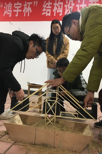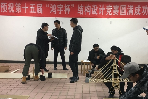 12月18日下午,由学校教务处主办,土木学院承办的太阳成集团tyc122cc入口第十五届“鸿宇杯”大学生结构设计竞赛模型加载决赛在云塘工科二号楼的土木工程大学生创新创业教育中心举行。我院共有18支队伍提交竞赛模型,其中9支队伍参加模型加载决赛,最终获得二等奖1项、三等奖2项的好成绩。