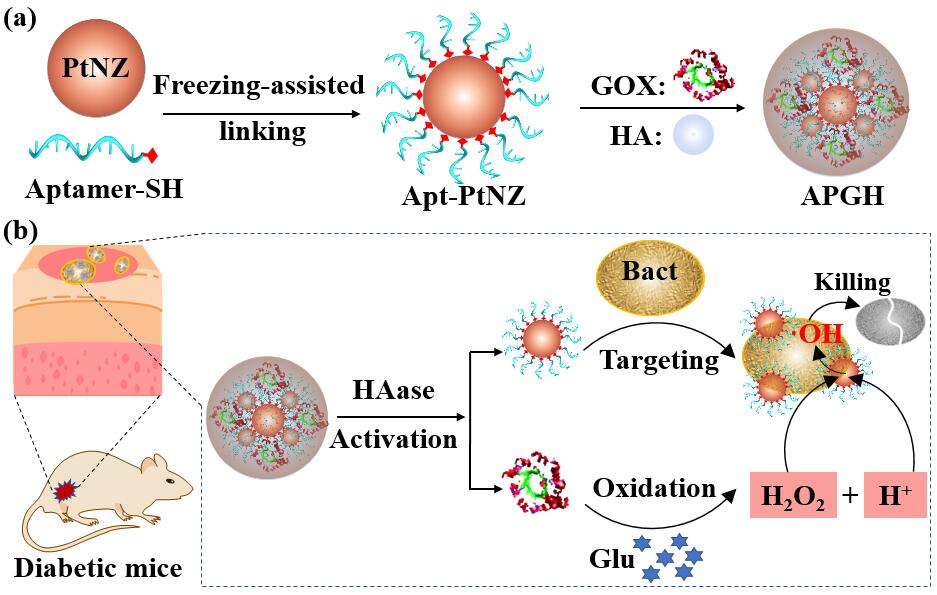 首先,基于DNA探针在铂纳米颗粒表面的高稳定性修饰和高保真信号释放的前期研究基础(Zhihe Qing, et al. Angew. Chem. Int. Ed. 2020, 59, 14044-14048; Zhihe Qing, et al. CCS Chem. 2020, 2, 1217–1230),卿志和博士课题组发展了一种细菌感染激活的纳米酶,在生理条件下同时打破局部pH和过氧化氢的限制,提高慢性伤口部位的抗菌效果。选取糖尿病伤口感染为研究模型,以DNA分子(细菌特异性核酸适体)功能化的铂纳米酶、葡萄糖氧化酶和透明质酸为组装单元,构建透明质酸酶(HAase)激活的纳米酶胶囊(APGH)。APGH在受感染的伤口中被细菌分泌的透明质酸酶激活,之后纳米酶通过表面修饰的核酸适体与细菌结合,葡萄糖氧化酶催化糖尿病伤口中高浓度的葡萄糖氧化,降低pH,补充过氧化氢,铂纳米酶在细菌表面原位生成·OH,提高了化动力学杀菌效果。APGH的活性转化与抗菌作用在体外实验和糖尿病伤口抗菌实验中得以验证。这种通过调控生理微环境以增强纳米酶活性的策略具有通用性,对促进纳米酶的生物学应用具有重要意义(Scheme 1)。该工作以“A Glucose-Powered Activatable Nanozyme Breaking pH and H2O2 Limitations for Treating Diabetic Infections”为题,于2021810发表在国际化学领域顶刊Angewandte Chemie,并入选VIP论文(Very Important Paper)和封面成果(Frontispiece),并被期刊官媒作新闻(News)报道。文章共同第一作者是太阳成集团tyc122cc入口硕士生陈丽芳、硕士生邢硕晖和雷艳丽博士,通讯作者是卿志和副教授和杨荣华教授。文章链接:https://onlinelibrary.wiley.com/doi/10.1002/anie.202107712