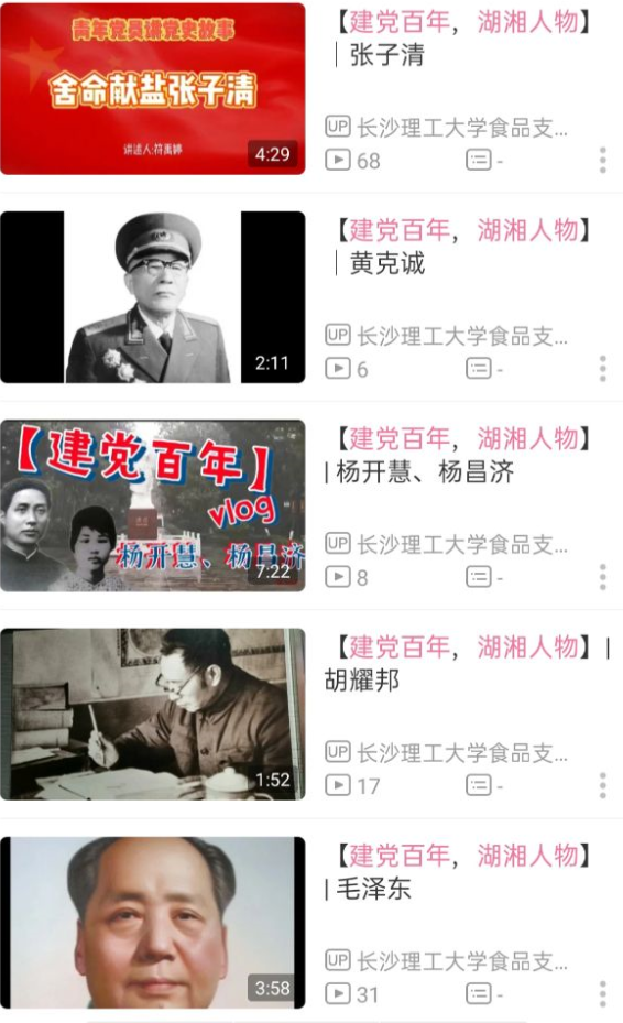 本次实践活动采用人民喜闻乐见的形式展现湖湘党史魅力,立体生动地将党史故事讲给人民听,在B站、喜马拉雅等主流平台发布原创“建党百年,湖湘人物”系列视频与音频。那把菜刀下流脓的踝骨,那颗深嵌骨头中的子弹,那一小包像钻石一样珍贵的盐粒,放射出无产阶级战士人性的璀璨光芒。“青山埋忠骨,浩气贯长虹”,张子清的高贵品质就如一棵傲霜斗雪的青松,屹立在永新城郊的东华岭上,也屹立在千千万万人民的心中。研究生党员曹婷积极组织活动并参与活动,她讲述了“中国理论界的鲁迅”李达的故事,讲述了他“三改理想只为救国,全力操持‘一大’,面临曲折人生始终一心向党,把自己的一切奉献给了中国解放事业和新中国的建设事业”故事。
