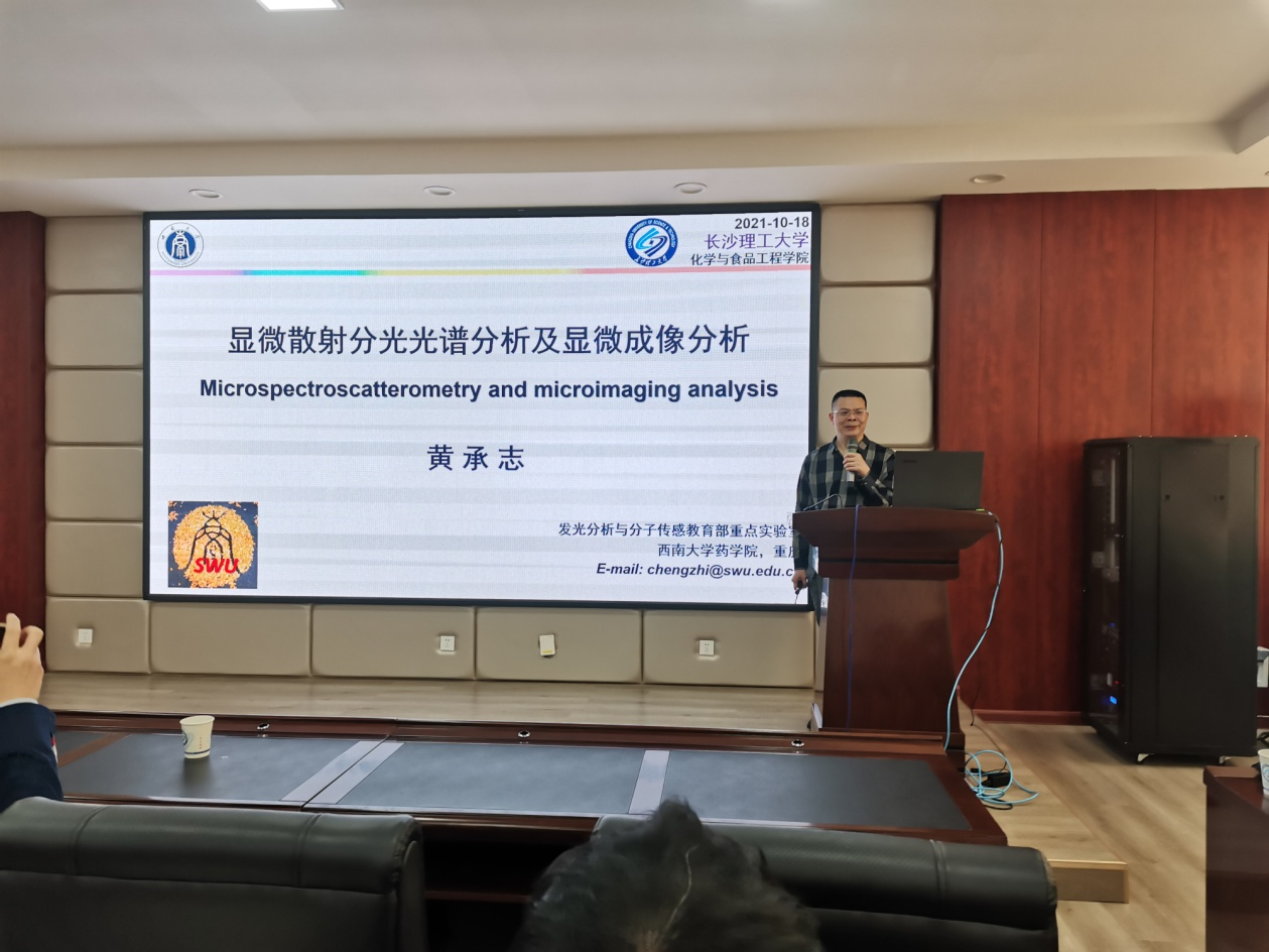 2021年10月18日1000,应我校化学化工学院的邀请,国家杰青、西南大学化学化工学院黄承志教授来我校开展学术交流,并在云塘校区工科3号楼A320报告厅举行了题为“显微散射分光光谱分析及显微成像分析”的学术报告会。报告会由化学化工学院副院长卿志和主持,化学化工专业青年教师和研究生百余人聆听了报告。
