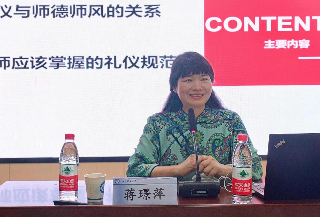 “学高为师,身正为范”。蒋璟萍用习近平总书记关于师德师风建设的重要讲话论述了“礼仪”在师德师风建设中的重要作用。她围绕“言行”、“仪容”、“服装”、“体姿”等几个角度出发,通过案例分析、现场展示等形式,为在场的老师送上一堂精彩有趣的礼仪课,现场氛围轻松、有趣,更有实用性。蒋璟萍对新时代高校教师职业行为十项准则作出了新的要求,并告诫所有教师,要“在循礼中彰显师德师风,择善而从、博学而文、约之以礼”。