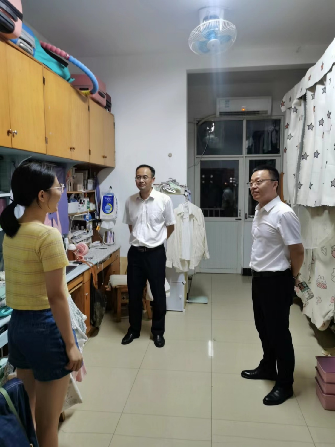 为培养同学们良好的校园生活习惯、督促大家共同营造和谐良好的生活环境,筑牢同学们的安全意识,本次走访过程中同时进行了宿舍卫生及安全检查,在对返校学生的检查过程中,排查了宿舍中可能存在的安全隐患,暂时没有发现大功率电器、私拉电线等问题,我院宿舍安全管理制度也得到了落实。查寝过程中宋刘斌对同学们的宿舍生活情况进行了了解,也对部分同学宿舍别样的整理方法给予夸赞,他说道:“宿舍的卫生情况往往可以体现同学们的精神面貌——干净整齐的宿舍代表了同学们积极向上的生活态度,简单的整理可以让寝室空间展示出别样的风采,大家应该认真学习那些内务整理优秀的寝室,让自己也有一个舒适的学习生活空间”同时老师们询问了同学们日常生活中遇到的其他问题,并给予相应的建议,督促同学们要养成良好的生活习惯,提高寝室生活安全意识。