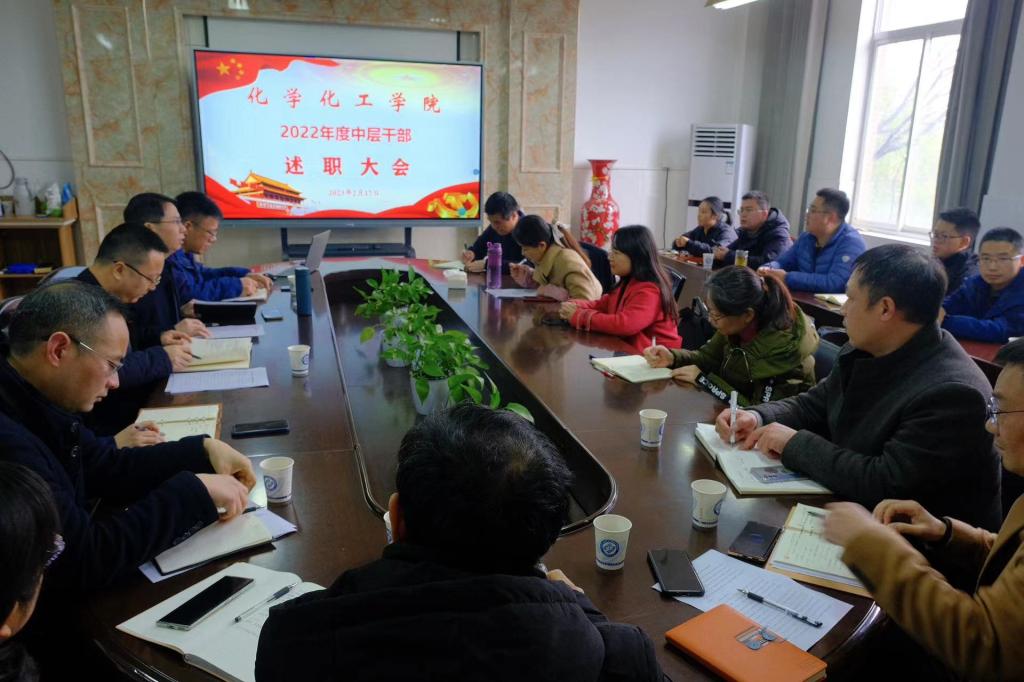 为全面回顾和总结2022年度学院各项工作,进一步提升中层干部的履职能力,加强学院干部管理科学化、规范化和制度化,2月17日下午,化学化工学院在工科三号楼B318会议室召开中层干部述职大会。会议线下听取9位中层干部的述职。学院全体党政领导班子和全体中层干部参加会议,会议由副院长(主持工作)张跃飞主持。