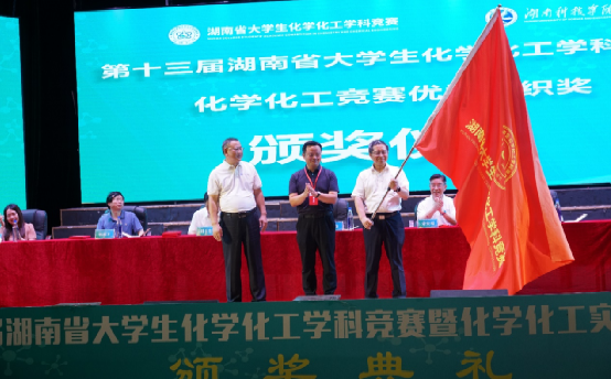 学校党委委员、副校长胡永乐出席闭幕式并代表下一届承办单位接受会旗,2024年湖南省第十四届大学生化学化工学科竞赛将在我校举行。我院师生合唱改编歌曲《长理欢迎你》,热忱欢迎各兄弟院校师生在2024年莅临我校参赛、交流和研讨。