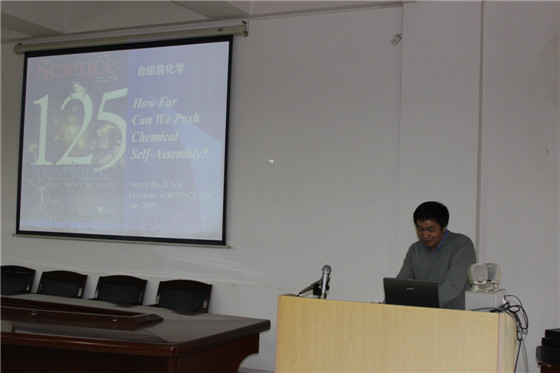讲座由我院曹忠教授主持,吴道新教授、张跃飞博士、汪红梅博士、李志伟博士、李江胜博士等及我院化工、应化等专业的学生参加。报告会上,于教授首先介绍了自己的学习与科研经历,指出了化学世界已从传统的四大化学延生到了多学科交叉的化学领域,总结了超分子自组装化学领域的新进展,特别是自己在有机金属超分子领域所做的工作。此外,于教授还与在座师生分享了他如何将中国的传统文化应用于化学研究等方面的经验。科普式的讲解让大家对超分子化学、自组装化学等交叉领域有了进一步的了解,对化学研究领域的新版图有了新的认识。