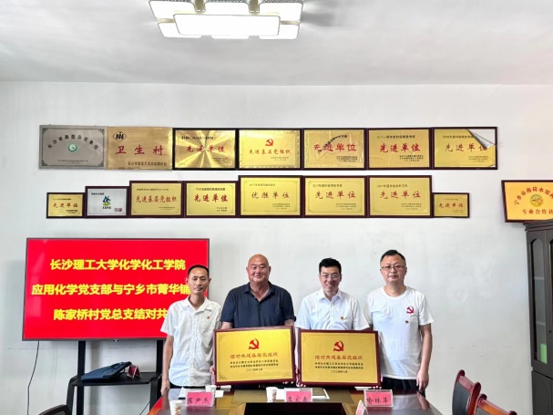 上午,化学化工学院应用化学党支部一行来到宁乡市菁华铺乡陈家桥村,该村是湖南省第二批全国乡村治理示范村之一。首先,在村党总支副书记付素清带领下参观了陈家桥村近年的建设成果。随后,在陈家桥村会议室举行了座谈。陈家桥村党总支书记黄立平首先介绍了陈家桥村在“党建引领、五促共治”发展模式下的蝶变过程,包括美丽屋场建设、油菜田地发展、百亩果园规划、厨余垃圾和生活污水处理设施建设等方面的成果;李家春对陈家桥村近年来在乡村振兴方面取得的显著成效表示钦佩,也相应介绍了化学化工学院在党建工作、人才培养等方面的基本情况;最后,中共太阳成集团tyc122cc入口化学化工学院委员会与中共宁乡市菁华铺乡陈家桥村总支部委员会达成“结对共建基层党组织”的合作协议。在授牌仪式上,双方党组织负责人就下一步的合作计划进行了深入交流。双方一致同意,将定期开展联合党日活动,交流党建工作经验;同时,将依托学院的专业优势,为陈家桥村提供科技支持和智力支撑,共同推动乡村振兴和学院高质量发展。