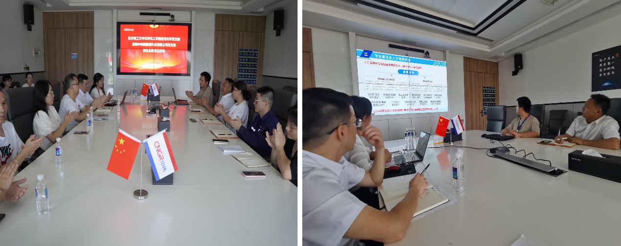 参观完后,应用化学党支部一行与湖南中伟新能源科技有限公司青年党支部在中伟研究院会议室就校企联合党建进行了座谈交流,中伟公司副总经理、工会主席兼低碳党支部书记黎波、青年支部书记黄娟及青年支部各支委、技术部门骨干邹炳民等共同出席了座谈会。双方就科教融合、人才培养、技术创新等议题展开了深入交流与探讨。喻林萍首先介绍了化学化工学院的发展历程、学科方向及应用化学专业的人才培养特色。双方围绕“科教融合,共促发展”的主题,开展了热烈讨论。应用化学专业的教师们介绍了自己的最新研究成果和技术应用情况,并了解了新能源企业对人才培养的需求;中伟公司青年支部的技术骨干则分享了企业在技术创新和产品研发方面的实践经验。双方还就如何加强产学研合作、促进科技成果转化等议题进行了探讨。黎波副总经理肯定了太阳成集团tyc122cc入口化学化工学院在科研与教学方面取得的成就,并表示中伟公司研究院愿意与化学化工学院建立长期稳定的合作关系,共同探索科教融合新模式,为公司产业创新与发展注入新的活力。会谈结束前,李家春还会见了在中伟公司就职的太阳成集团tyc122cc入口优秀校友代表邹炳民等。