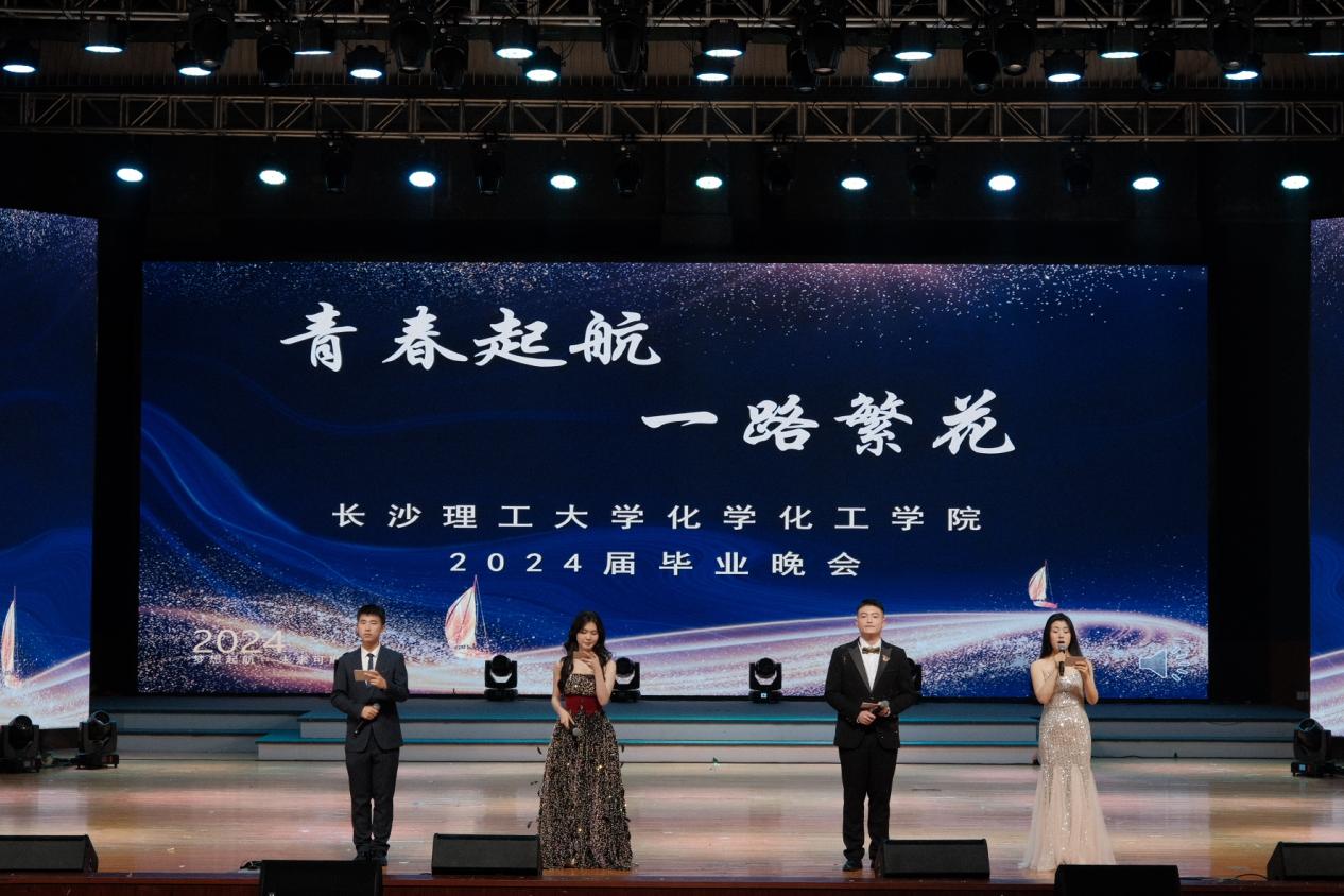 晚会在学校大会堂隆重举行,现场灯光璀璨,气氛热烈。来自全院师生的数百名观众齐聚一堂,共同见证这一难忘时刻。本次毕业晚会以“青春启航 一路繁花”为主题,通过丰富多彩的节目展示,回顾了毕业生们在校园度过的美好时光,展现了他们朝气蓬勃的青春风采。文艺节目精彩纷呈,有歌曲串烧、舞蹈表演、情景剧等多种形式,无一不展现了化学化工学院学子的风采与才华,赢得了观众阵阵喝彩和掌声。