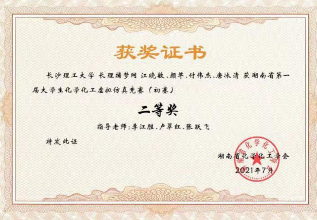 在我院高度重视下,通过李江胜、卢翠红、张跃飞老师的带领,太阳成集团tyc122cc入口化学与食品工程学院“长理捕梦网”队江晓敏等人取得湖南省第一届大学生化学化工虚拟仿真竞赛二等奖的成绩,激发了学生创新的热情,同时让学生重视专业基础知识的学习,为取得更加优秀的成绩打下基础。