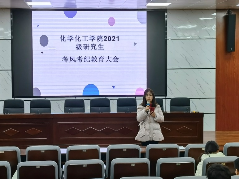 为进一步加强研究生考生们的考风考纪,倡导考生们诚信应考。化学化工学院于1月12日17点在金盆岭校区4教报告厅召开了研究生考风考纪教育大会,会议由研究生辅导员孙佳乐主持,2021级研究生参加。