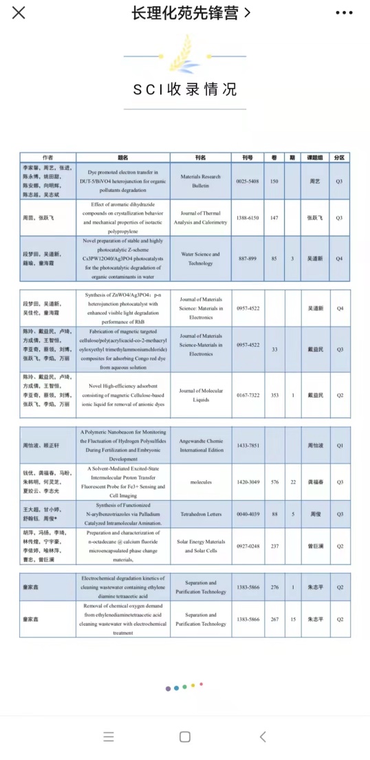 近日,疫情扩散,化学化工学院积极拓展研究生科研分享渠道,于线上开展“学术成果展+经验分享会”。学院研究生会收集近期在研究生中的优秀学术成果,汇编成“学术成果展”,在学院公众号推送。在2022年第一季度中,化学化工学院研究生发表的SCI论文有12篇、CSCD论文1篇,共计13篇。在SCI论文中:有1区1篇,2区4篇,3区5篇,4区2篇。“这种分享方式更直观,让研究生能及时学习和借鉴身边优秀同学的经验,为己所用”,研究生会主席缪楚宇说到。