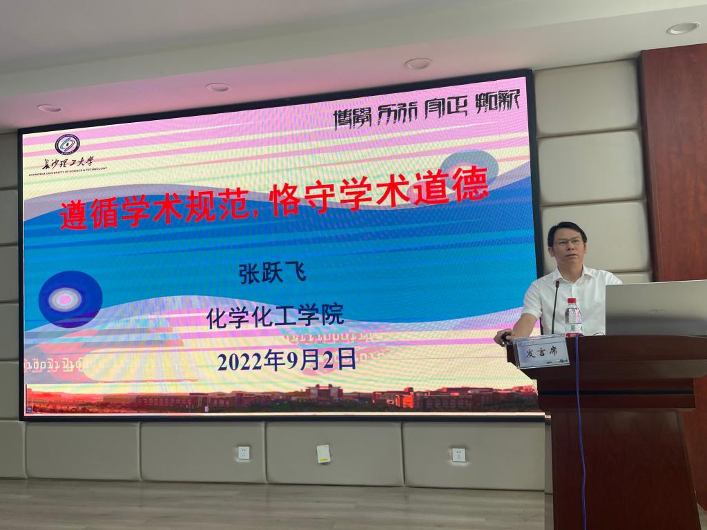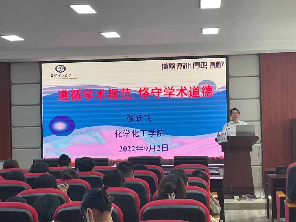 为规范学位论文管理,推进良好学风的建立,提高人才培养质量,加强我院2022级研究生的专业学术道德,9月2日上午10点,化学化工学院2022级研究生新生学术道德讲座在云塘校区工三A320报告厅隆重举行,本次会议由张跃飞副院长主讲,研究生辅导员孙佳乐主持,全体2022级化学化工学院研究生参加。