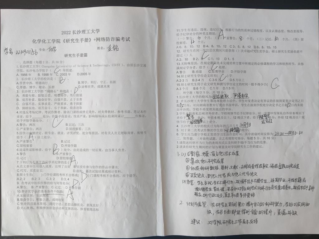 为了帮助2022级研究生新生尽快转变身份融入校园,熟悉校园教育教学管理生活秩序,引导和督促学生增强遵守校规校纪意识,提高自身文明修养,9月4日19点,化学化工学院在云塘校区工三B220教室组织了2022级新生《研究生手册》考试。