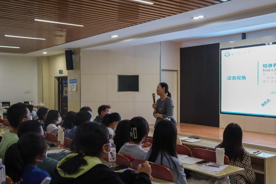 首先,喻玲强调写新闻稿要深挖新闻事实,不能记“流水账”,要尽量做到人无我有,人有我新,人新我优。她从三个方面具体讲授了如何写好新闻。她针对以下几点做了详细的说明。第一,好的题目是成功的一半。新闻稿标题应当短小精悍,引人入胜,激发读者好奇心。第二,好的内容是新闻稿的灵魂。新闻的内容部分就是“如何把活动策划写成新闻稿”的问题,两者都是围绕“是什么、怎么干”去构思描述。新闻稿的受众群体是读者,因此要从读者的角度将场景、背景、意义和整体情况说明白。第三,怎么才能写好新闻稿?喻玲提醒大家,要真正写好新闻稿是没有捷径的,要多看、多写、多思考,才能妙笔生花。