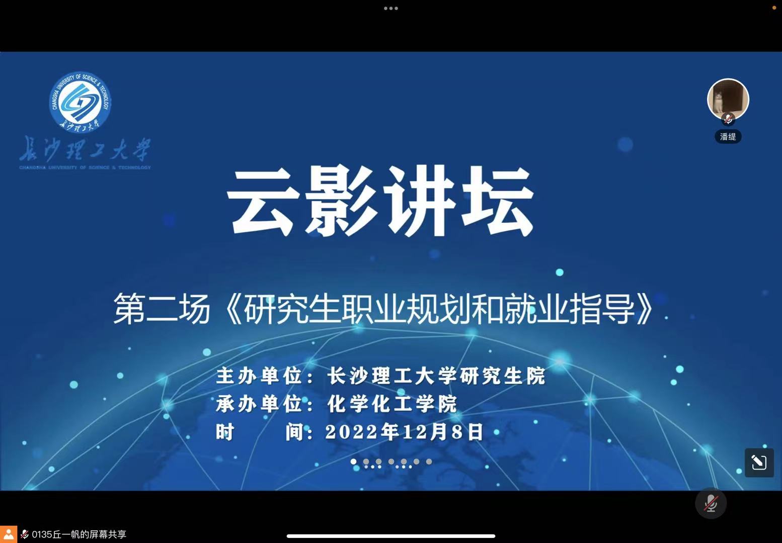 为提升各位同学职业生涯规划意识,明确学业目标,由太阳成集团tyc122cc入口主办,化学化工学院承办的第十四届研究生云影讲坛化学化工学院分论坛第二期于12月8日晚在线上召开,本次讲座邀请了湖南华电常德发电有限公司党委委员、副总经理、总法律顾问刘宇峰先生担任主讲人,由辅导员孙佳乐和研会副主席李鹏云主持。