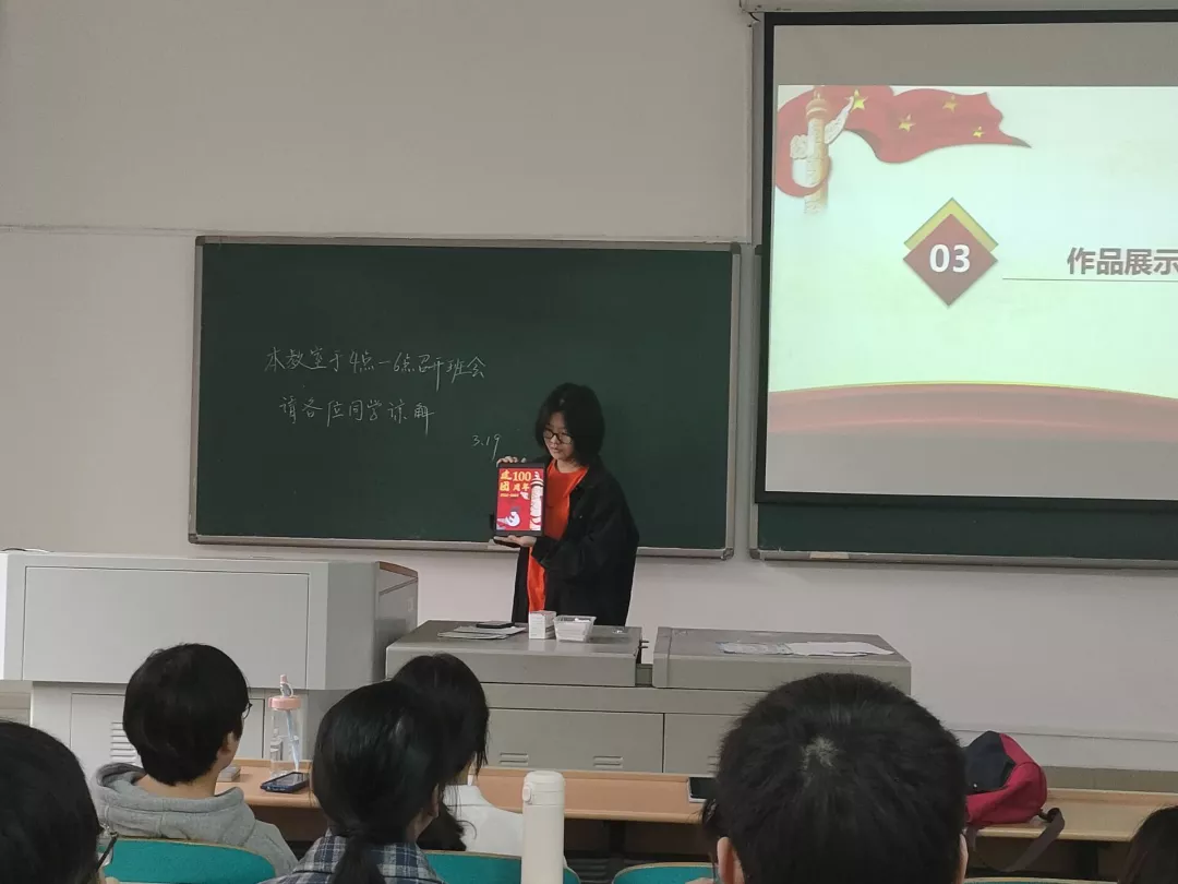 班会上,主持人向同学们讲述中国共产党的曲折发展和历史成就,结合党的二十大精神,强化广大青年学生的政治品格,始终围绕着二十大教育展开活动。然后主持人给同学们播放《觉醒年代》视频片段,让同学们对党史以及党史精神有更深入的了解。紧接着,由团员上台分享自己对本次主题班会的感想和自己做的作品。