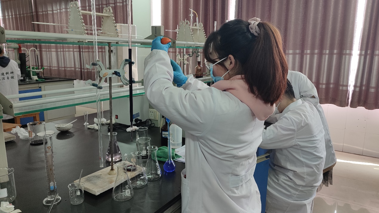 经过实验安全培训后,比赛正式开始,选手们都开始动手操作。选手梁冰表示:“实验中需要进行大量计算并准确称取相关物质,十分考验我们的实验动手能力。”在二草酸合铜酸钾的组成测定实验中,同学们屏气凝神地进行着滴定实验,没有丝毫松懈,因为多一滴就会有很大误差。评委们一边对选手进行打分,一边对操作不规范之处提出建议。经过五个小时的紧张操作,一批实验技能“高手”脱颖而出,最终决出多个奖项。