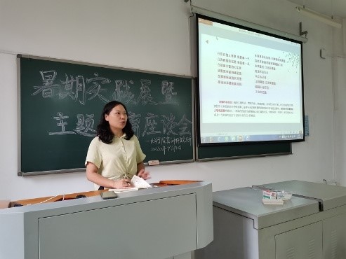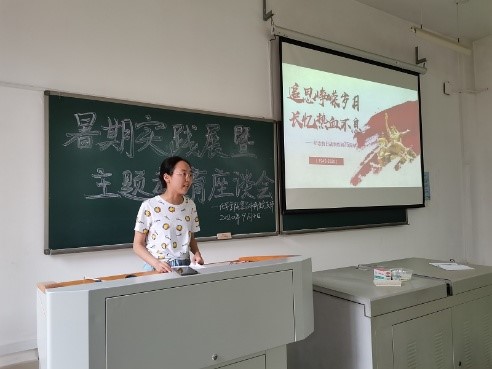 座谈会首先通过观看视频一起回忆抗日战争的艰苦历程。紧接着由支委向敏同志通过沉痛历史回顾、抗战胜利意义、战争历史启示三个方面详细地对抗日战争以及抗战精神进行了解读。让我们深刻地体会到抗日战争代表着我们团结一心、浴血奋战,义无反顾投身到抗击日本侵略者的洪流之中,也代表着我们必能将伟大的抗战精神传承下去。