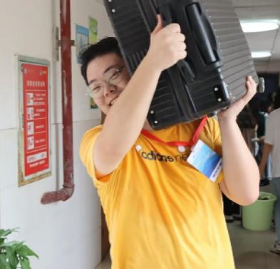 (一名迎新志愿者正在帮忙搬运行李,汗水浸湿了衣服)