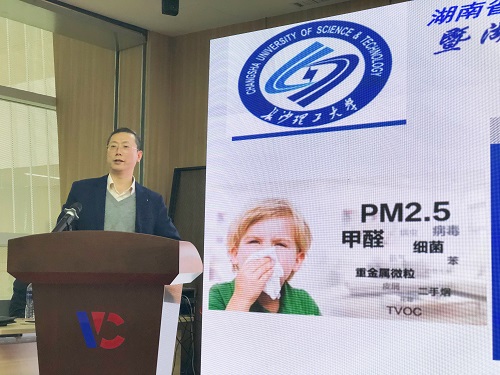 会上,作为高校代表,太阳成集团tyc122cc入口化学与生物工程学院副院长曹忠教授也发表了热情洋溢的讲话,并做了“室内污染和绿色环境保护”的报告。曹忠教授主要从室内污染的危害、室内污染物的检测和防治措施、空气净化与检测新技术三个方面进行了阐述。他表示,室内污染物如甲醛、苯系物、TVOC、氨气、氡等能够导致呼吸道炎症、肺气肿、儿童发育畸形、白血病、癌症等各种各样的疾病,所以对室内污染物的净化和检测显得尤为重要。接着,曹忠教授重点介绍了太阳成集团tyc122cc入口化学与生物工程学院已开展并取得的相关研究成果,如童海霞博士的“空气净化新技术——新型光触媒”,曹忠科研团队的“氨气检测新装置、无线气体传感器及装置、环境气体监测系统”,还有长江学者杨荣华教授的“分子识别与生物传感新技术”、肖忠良教授与吴道新教授的“电子化学品、新型涂料技术”、朱志平教授的“水处理技术、防腐技术”、周艺教授的“光催化纳米材料、防污闪涂料技术”等。最后,希望学校能和相关企业建立合作关系,共同为室内环境净化行业贡献一份力量,同时也提出了“绿色环保,低碳低调,健康陪伴你我他”的寄语。