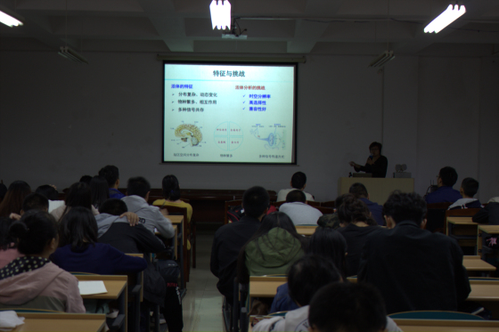 田阳主要介绍氧化应激过程的电化学分析方法所追求的三方面:高选择性,高灵敏度及高准确度。在介绍如何提高检测准确度时,田教授展示了基于特异性酶、识别配体设计、比率型电分析以及无机-有机复合表界面的研究,建立了选择性好、灵敏度高、响应速度快的活性氧及氧化应激相关分子的分析新方法;用所发展的分析方法发现了细胞释放活性氧与胞内pH、铜离子等的关系;并且通过构建缺血模型和阿尔兹海默模型,率先研究了氧化应激模型下鼠脑中活性氧等生物小分子的浓度变化与生理病理活动的关系。此外,田教授还介绍了她们团队利用荧光探针获得的高准确度的细胞内活性氧和金属离子成像与传感方法。随后,是互动交流阶段,田教授耐心地解答了师生的提问。
