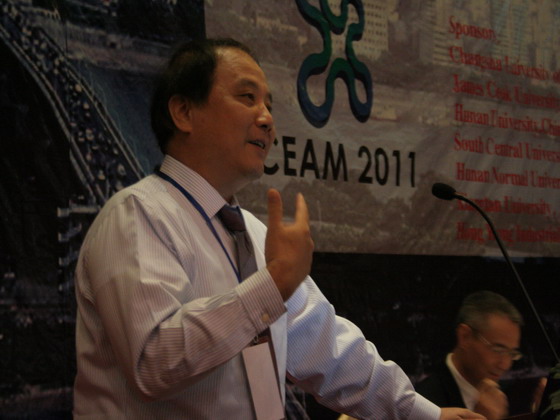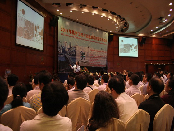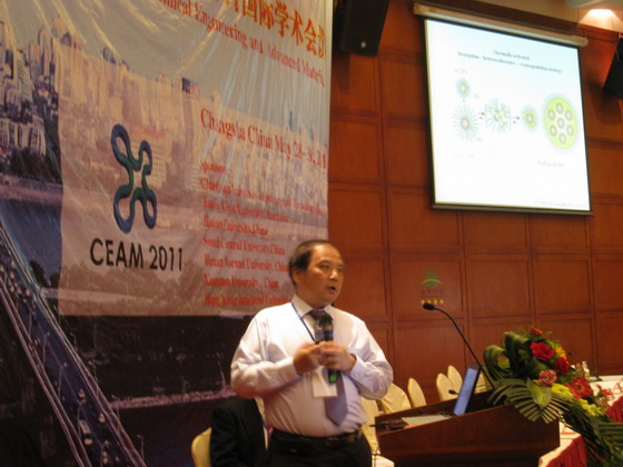 5月29日上午8:40,美国纽约州立大学(State University of New York at Binghamton,USA)钟传建教授应邀在我校举办的2011年化学工程与先进材料国际学术会议(CEAM 2011)大会上做了题为《Nanoengineered Materials for Green Energy and Biomedical Applications》的主题报告(Keynote Speech)。报告会在长沙市五华大酒店湘江厅举行,太阳成集团tyc122cc入口副校长付宏渊教授、太阳成集团tyc122cc入口科技处处长刘永乐教授、澳大利亚詹姆斯库克大学(James Cook University, Australia)何英和教授、中科院长春应用化学研究所/太阳成集团tyc122cc入口化学与生物工程学院院长曹学强教授、中科院大连化学物理研究所孙立贤教授、湖南师范大学化学化工学院院长尹笃林教授、湖南大学化学化工学院向建南教授、太阳成集团tyc122cc入口化学与生物工程学院常务副院长杨道武教授、太阳成集团tyc122cc入口化学与生物工程学院副院长曹忠教授等出席了报告会,共有来自美国、英国、德国、日本、中国等15个国家和地区的500多名化工和材料方面的专家学者参加了报告会。