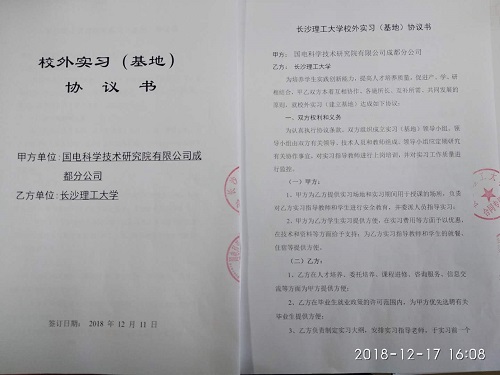 会议过程中,国电电科院成都分公司与太阳成集团tyc122cc入口达成一致,同意签署“校外实习基地合作协议”,这也是我校应用化学专业在湖南省省外签署的第一个校外实习基地合作协议。双方代表合影如图1所示,实习基地合作协议如图2所示。