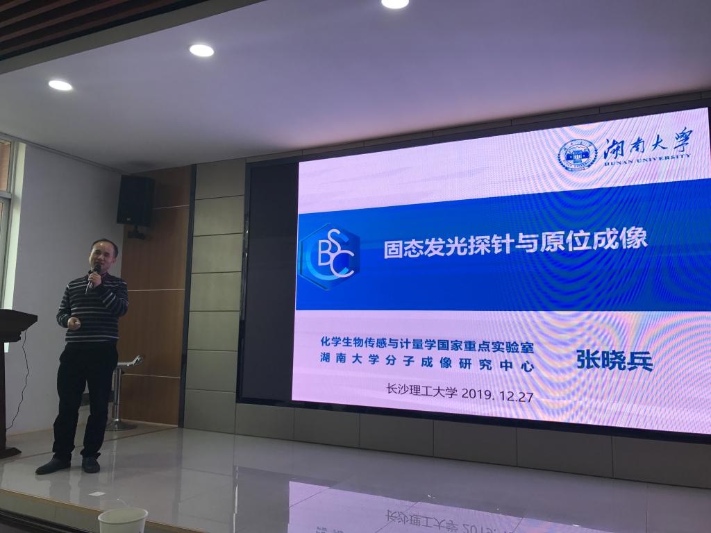 为加强学术交流与合作,促进学科建设和发展,拓展学生知识视野和对学科前沿的了解。两位教育部“长江学者”特聘教授、国家杰出青年科学基金获得者,南京大学鞠熀先教授和湖南大学张晓兵教授应邀来我校,于12月27日下午在新能源大楼三楼学术报告厅为我校师生分别作了题为《功能分子原位检测及其介导的癌症精准诊治策略》和《固态发光探针与原位成像》的学术报告。报告会由化学与食品工程学院院长杨荣华教授主持,化学学院等师生代表80余人到场聆听。