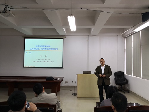 11月8日上午,国家杰出青年科学基金获得者、教育部“长江学者”特聘教授、兰州大学功能有机分子化学国家重点实验室主任王为教授应邀来我校进行学术交流。在云塘校区工科三号楼A320会议室,王为教授以“共价有机框架材料:从共价组装、结构表征到功能应用”为题,给大家带来了一场学术盛宴。学术报告会由化学与生物工程学院院长杨荣华教授主持,副院长曹忠教授、副院长朱志平教授、副院长张跃飞教授及化学、化工、食品等相关学科的老师、研究生及本科生100余人参加了学术报告会。