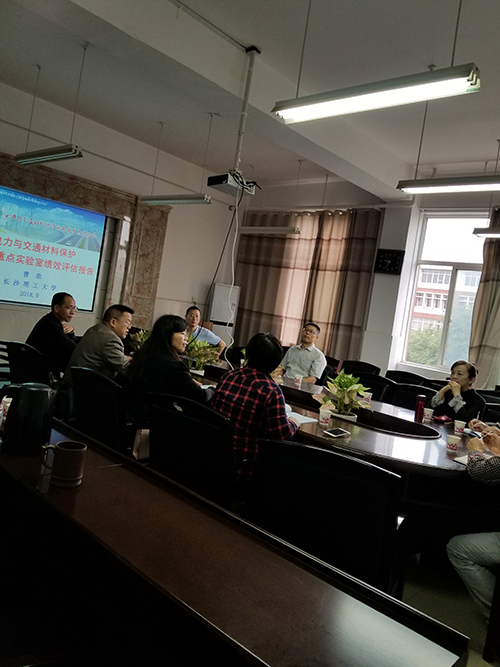 首先,重点实验室主任曹忠教授从重点实验室基本信息、主要建设成绩、代表性研究成果、队伍建设与人才培养、开放交流与运行管理及中长期发展设想等方面进行了详细汇报,重点介绍了“电力与交通材料保护”湖南省重点实验室在2014-2016年间的发展和成果。随后,专家组认真地审阅了评估材料,并就自评报告中的一些细节问题,与重点实验室骨干成员进行了广泛交流;最后,专家组实地考察了实验室场地、仪器设备、运行管理等方面的情况。