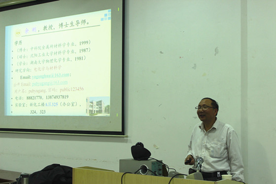 10月18日下午,湖南大学化学化工学院物理化学学科带头人余刚教授应邀来我校化学与生物工程学院进行学术交流访问。在云塘校区工科三号楼A-320会议室,余教授做了题为“网络时代的物理化学教材变革”的学术报告,报告会由副院长曹忠教授主持,副院长王建辉教授、朱志平教授,化学、化工等相关学科的教师、研究生及本科生100余人参加了此次学术交流活动。