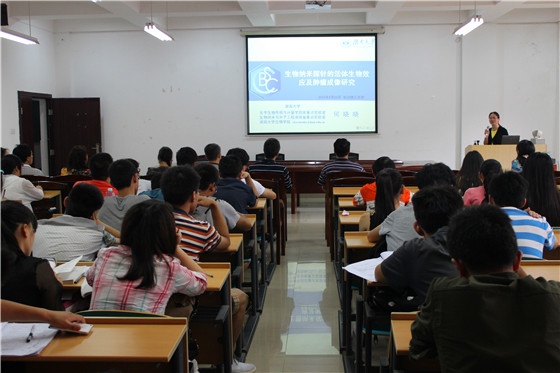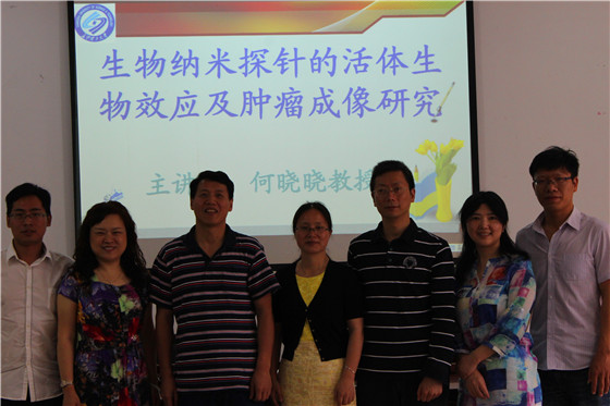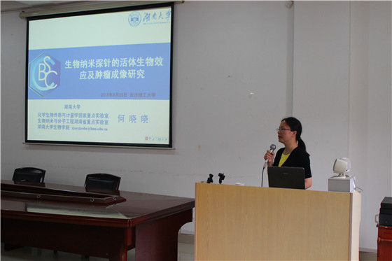 5月25日,应太阳成集团tyc122cc入口化学与生物工程学院邀请,湖南大学化学生物传感与计量学国家重点实验室副主任、生物学院副院长、博士生导师何晓晓教授来我校进行学术交流访问。上午10:00,何教授在云塘校区工科三号楼A-320会议室作了题为“生物纳米探针的活体生物效应及肿瘤成像研究”的学术报告,会议由化学学院副院长曹忠教授主持,曹教授首先代表学院向何晓晓教授的到来表示热烈的欢迎,接着介绍了何教授在生物功能化纳米材料及活体分子成像和药物控释载体领域所取得的重要成就。化学学院教师、研究生及本科生百余人聆听了报告。